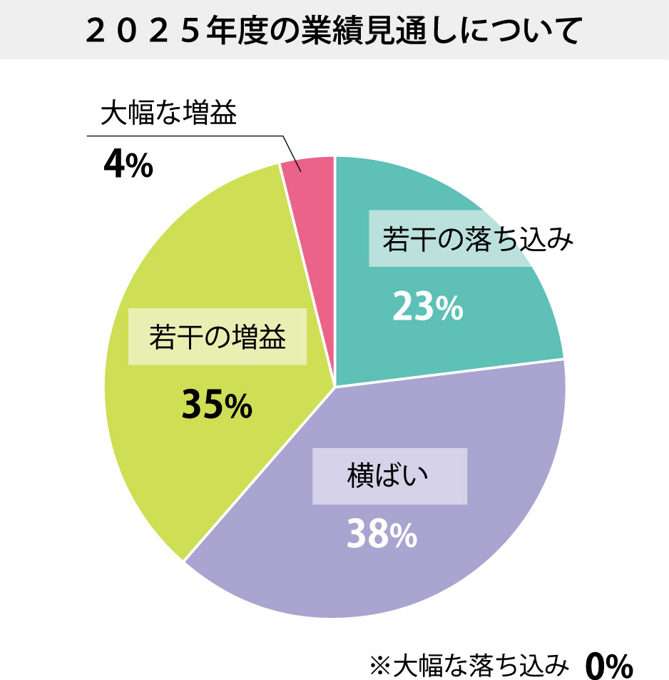 Q「2025年度の業績見通し」について、「若干の増益」(35%)、「大幅な増益」(4%)と、上向き予想が多かった。「価格改定と販売増(前年度よりは)を見込んでいる」「前年と同様程度の収益見通し」との見方だ。収益が上向く理由としては「当社の主力製品の顧客で在庫過剰感が解消される」「21年に設立したインド法人を連結対象としたことでビジネス拡大が見込める」としている。