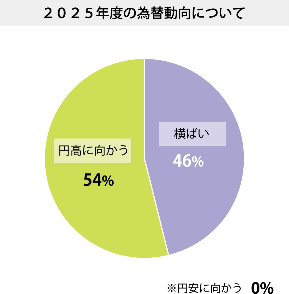 Q「為替動向」について、「円高に向かう」(54%)が最多の回答だった。「前期は日米金融政策の方向性の相違を背景に、前半は対ドルで円安が進行したが、足元では日本は利上げ・米国は利下げの方向で円高トレンド。今期も、両国の基本的な金融政策の方向性は変わらず、どちらかと言うと円高が進む可能性がやや高い。ただ、不確定要素として、米関税政策の影響で米国のインフレが進行・金利が上昇し、利下げペースが鈍化した場合、円安方向に動く可能性もあり、注視が必要」と今後も予断を許さない状況だ。