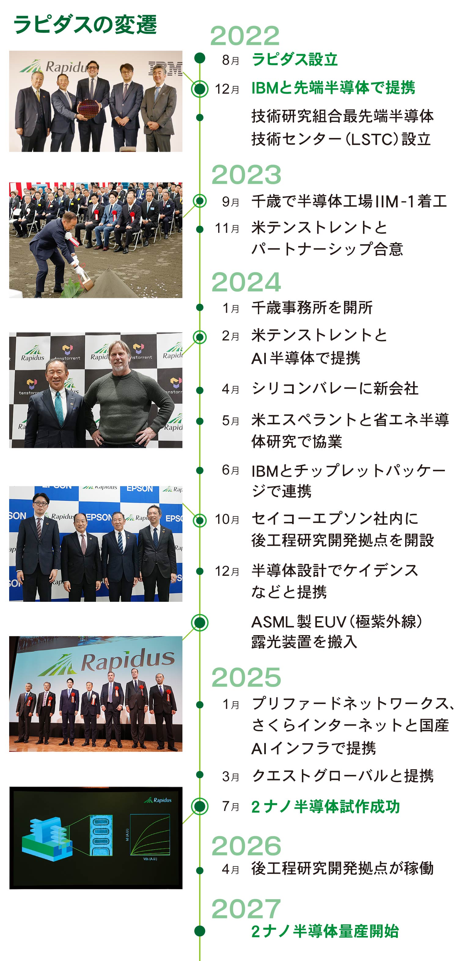 前工程では23年には欧州imecのコアパートナープログラムに参加。IIM-1を着工した。24年にはテンストレントとの協業を発表。米シリコンバレーにラピダスデザインソリューションズ(RDS)を開設し、北米での顧客開拓、設計支援を始める。人材育成に向けては北海道大学と連携協定を締結。半導体設計ソフト(EDA)ベンダー大手の米シノプシス・米ケイデンスとも協業し、ユーザーが半導体設計に使用するプロセスデザインキット(PDK)の開発も並行して進める。