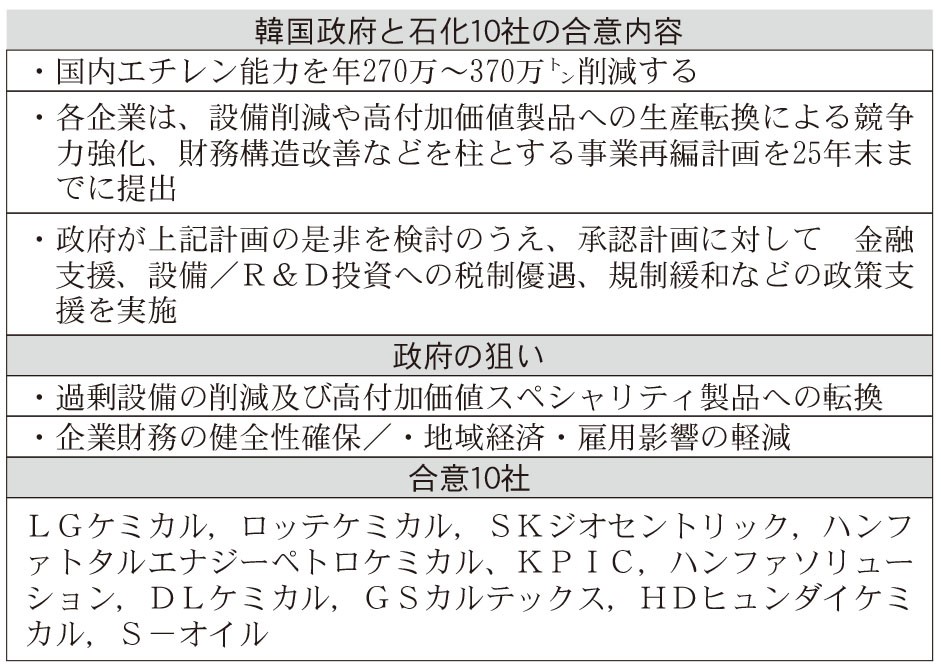 韓国政府の発表によると、石化10社は計270万~370万トンのエチレン能力削減を目指す。同国の全体能力は年間約1300万トンで、削減幅は全体の20~28%に相当する。各社は今年末までを期限に、事業再編計画を政府に提出。計画が認証されれば、再編実施に当たり政策支援を得られる(表参照)。