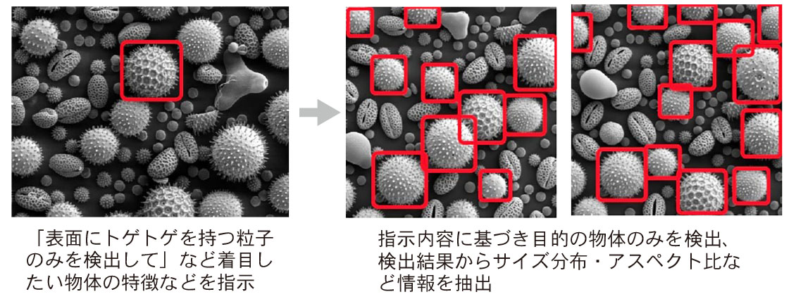 画像情報の抽出機能は、形状やサイズといった特徴を指示または少数事例を提示することで、目的の物体だけを検出することを可能にする。この機能により、ユーザーの注目している情報に着目した解析が可能になる。検出結果からサイズ分布やアスペクト比といった情報をまとめることも可能となる。