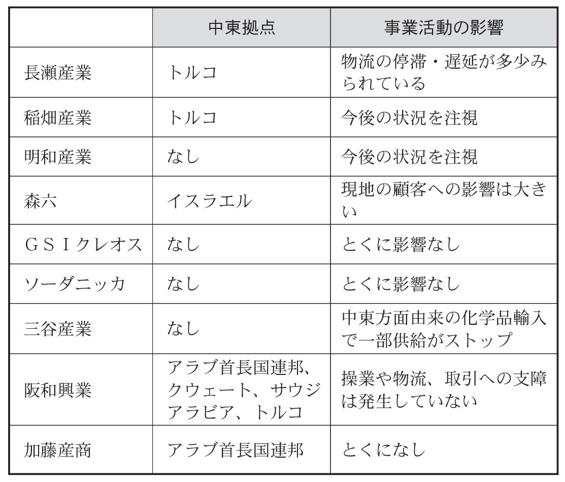 中東エリアに拠点を持つ大手の化学品専門商社は長瀬産業や稲畑産業、森六など。その他の大手商社では阪和興業や加藤産商などが同エリアに進出している。