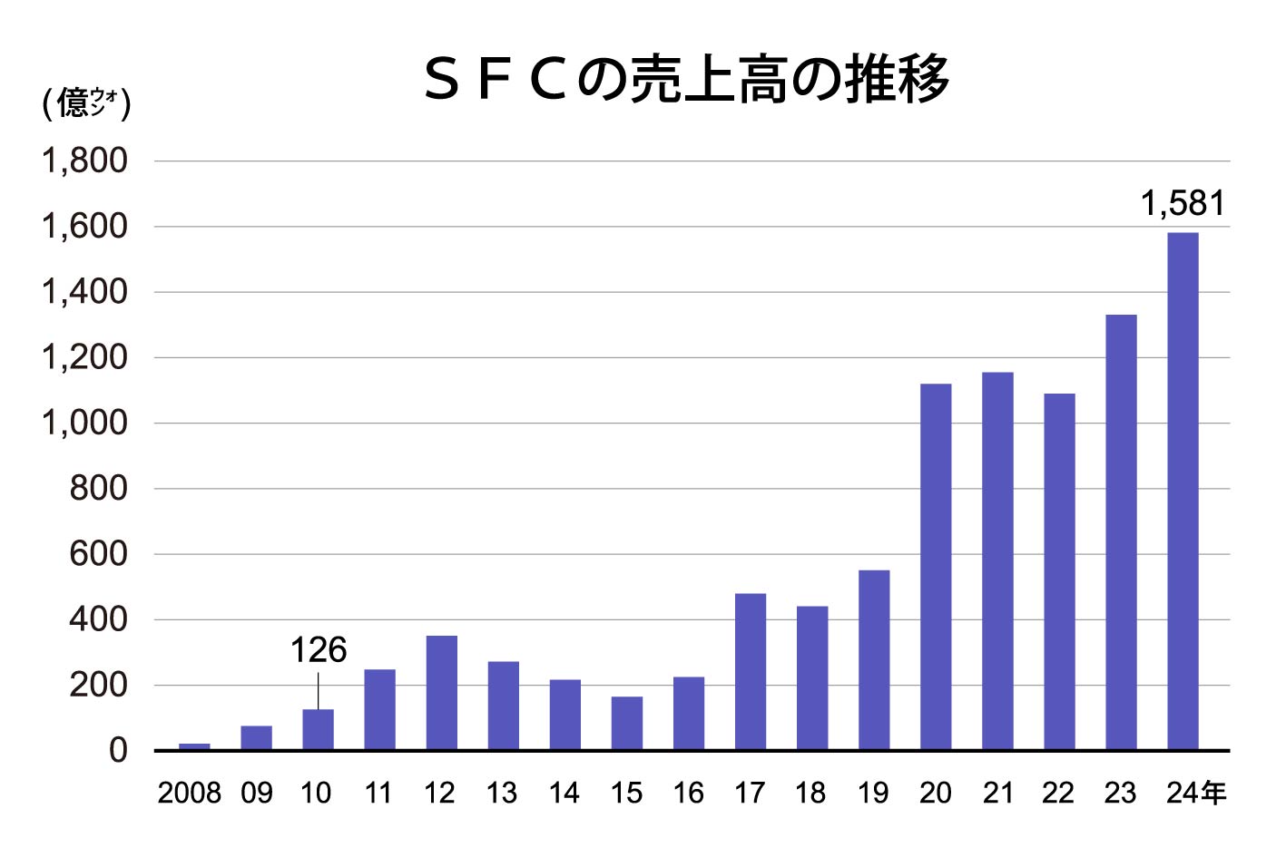 現在、青色発光材料を中心とする有機EL材料はSFCの売上高全体の約8割を稼ぐ屋台骨だ。有機ELパネル市場拡大の波に乗り、10年に126億ウォン(約13億円)だった同社の売上高は24年に1581億ウォンと約12倍に拡大した。
